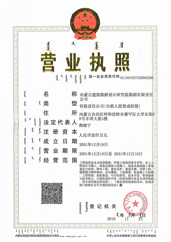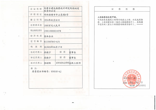 • 內(nèi)蒙古建筑勘察設(shè)計(jì)研究院勘測(cè)有限責(zé)任公司,是全國(guó)首家完成 轉(zhuǎn)企建制的省級(jí)建筑勘察設(shè)計(jì)單位。公司前身為內(nèi)蒙古建筑勘察 設(shè)計(jì)研究院勘測(cè)分院, 成立于1954年 ,經(jīng)過(guò)六十多年的發(fā)展, 現(xiàn)已成為全區(qū)技術(shù)力量雄厚、專業(yè)設(shè)置齊全的集巖土工程勘察 、 設(shè)計(jì)、治理、檢測(cè)、監(jiān)理、咨詢、水文地質(zhì)勘查、工程測(cè)量、科 研為一體的綜合性企業(yè) ... ... [查看詳情]